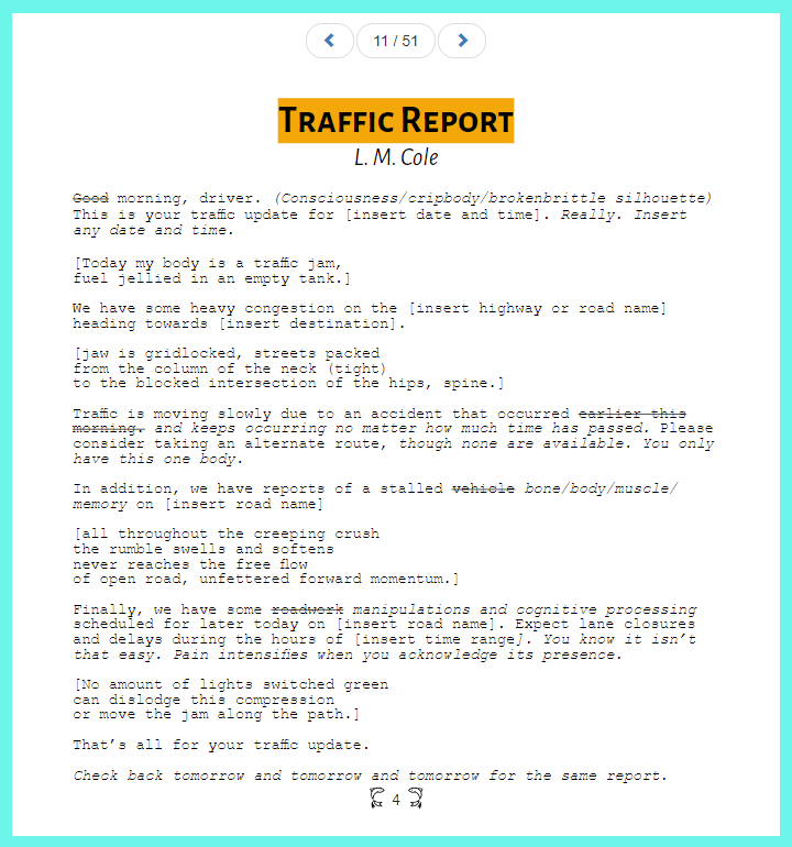 This found/hybrid poem was published January 30, 2024 by Cutbow Quarterly! The whole issue is beautiful, and you can find it HERE.
